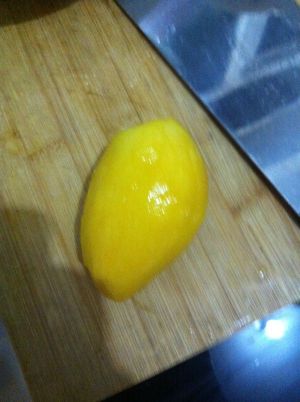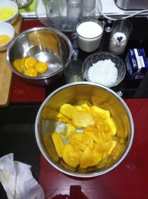 我是用搅拌机打的芒果,打的很碎,几乎是汁了,里面加了糖和柠檬汁一起打