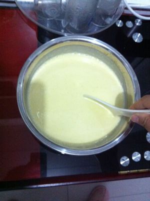 蛋黄用手动打蛋器打散,其实用电动的感觉能好,因为手打的毕竟没有机器打的均匀,其实就是第一次做的冰碴感太重,所以之后做的每一种需要搅拌的都想用电动打,打散后加的牛奶和糖,在电磁炉上慢火煮,边缘稍稍沸腾就行了,要不该变成蛋花汤了