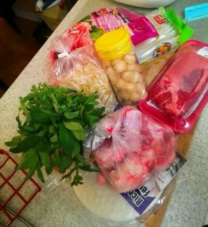 越南河粉煮好后过冷水沥干,一碗一团分好。碗,开水烫热,放一把绿豆芽,一个粉团,薄荷,柠檬罗勒,牛腩薄片,辣椒圈,浇上调好味的汤底,鱼露汁,吃时挤上青柠汁。