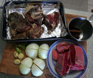 牛骨可以烤一下,这样汤可以更快就好,花椒八角桂皮要炒一下,牛腩切块,洋葱切大块,香菜根很重要哦,汤的香味就是指望它了。