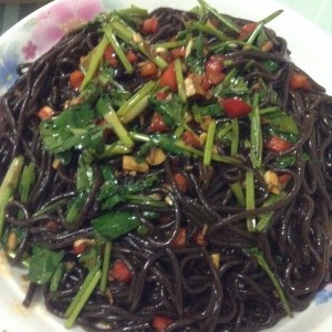 蕨根粉丝煮熟盛出,加少许麻油拌匀避免粘在。