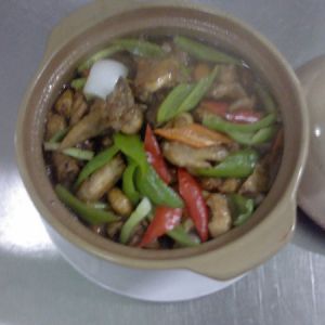 锅内留少许油煸香耗油 放入鸡块炒 加少许水 花雕酒 姜葱蒜 调味 调色 烧至入味 倒入砂锅中煲放入青红椒(洋葱放入砂锅中垫底)
