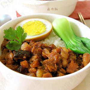 最后盛入米饭,浇上卤肉汁,再摆上烫熟的青菜叶、切开的卤蛋,就可以吃了。为了防止油腻,最好再另外准备一盘青菜同食。