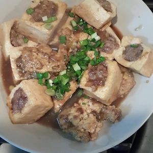 豆腐用小勺儿挖出一小块填入肉糜,放平底锅内,煎成微黄