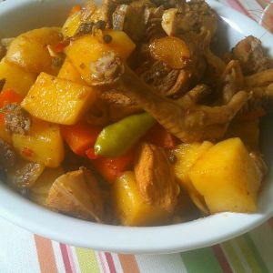锅中到入啤酒,煮沸后加入土豆等,继续煮。最后加入调味料,大火收汁。
