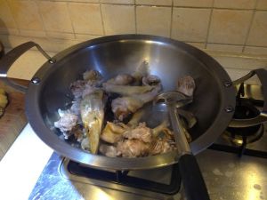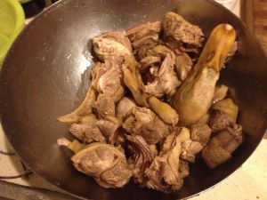 热锅倒入适量植物油。不要多放,能让鸭块均匀沾到即可,下鸭块炒制。炒制过程中加入适量料酒。至料酒气味消失起锅,转炖锅。