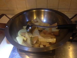 用炒制鸭块剩下的余油炒制姜片、泡萝卜段。至水汽变少起锅。和余油一并倒入炖锅。