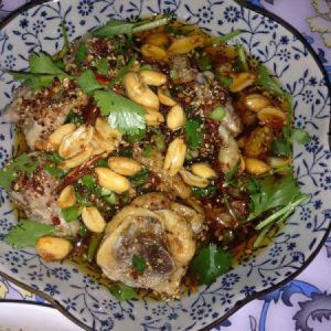 将蒜蓉、酱油、醋、糖、盐、红油及少量的鸡汤混合成调味汁 将鸡腿剁成条状,整齐的码放在盘中 浇上兑好的调味汁,在表面撒上少量小葱及花生即可