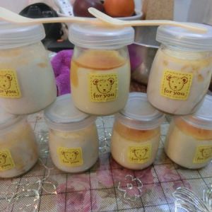 把牛奶倒入鸡蛋里,搅拌,放入布丁瓶内