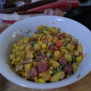锅中放油,油热后放入鸡蛋馒头丁,炒至馒头丁个个分离后,放入各种配料,炒勻后出锅。