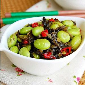 4、加入少许水,没过毛豆高度的1/4即可,稍煮片刻。