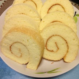 放凉后翻转过来,卷起(揭去锡纸的那面是向下的,卷起后就是蛋糕卷的表面)。即可(卷起来之前也可以涂上自己喜欢的果酱或者色拉酱等)