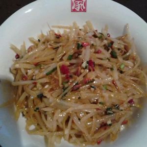 热锅,烧油(油烧七成热,不易太热会把辣椒粉烧糊的),然后把准备好的蒜泥入锅炝香下,一起倒入准备好的土豆丝里面,倒的时候打圈到均匀,然后搅拌装盘,开吃!