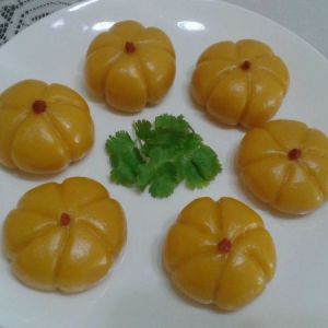 把面团分成乒乓球大小,捏成型,用勺子柄压出南瓜的纹路。加枸杞子做柄。冷水上锅蒸15分钟。