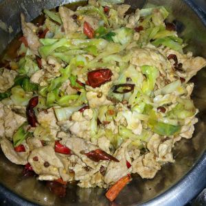 将炒熟的白菜盛出放置一旁备用,将肉片放入锅中翻炒放入鸡精,盐,干辣椒,麻油,添一点儿水将肉片煮熟