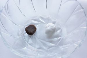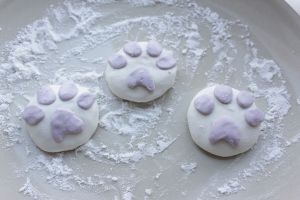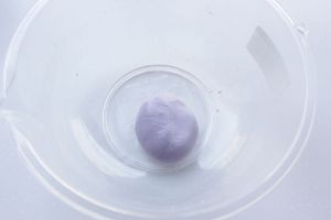 再取紫色糯米团,捏成脚掌的形状,粘在做好的白色糯米团上,轻轻压实