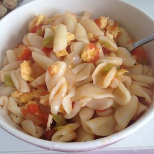 首先备料,将洋葱、香菇切丁,尖椒切丝,番茄用滚水烫后去皮(烫之前不要忘记上面划小十字哦)后切碎备用。鸡蛋打散,锅内放油进行翻炒,鸡蛋炒30秒左右,将前面准备的蔬菜备料放入,翻炒,加入适量盐和鸡精,大料,加水没过菜,中火熬煮。