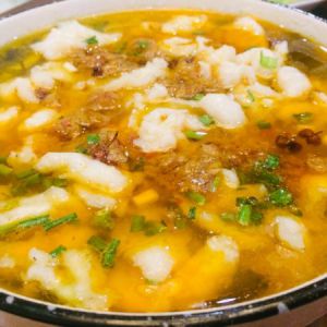 保持大火,缓缓加入腌好的鱼肉片,注意要尽量让汤汁在整个过程中保持沸腾,待鱼片由浅浅的粉红变白断生(大约半分钟至一分钟)