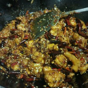 加入之前的鸡肉,生抽,芝麻,转小火慢炒五分钟入味后,出锅~