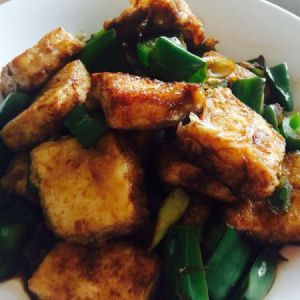 刷锅,放入少量油,大葱大料爆香,放入提前准备好的青椒或其他青菜炒熟,此时放入豆腐,快速轻轻翻炒均匀后,倒入适量蒸鱼豉油后拌匀出锅。