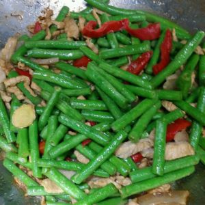 豇豆倒入锅中翻炒加入适量的水,出锅前加入适量的盐,我家做菜不用味精,都是加一点点糖可以提鲜。