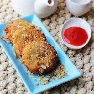 土豆饼先沾面粉,再沾蛋液,最后在面包糠里两面滚一下
