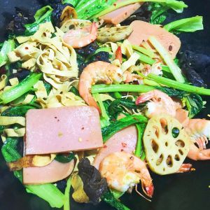 放入油麦菜,午餐肉,鲜虾等,继续翻炒至出锅即可。