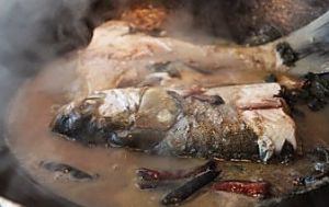 添上白水,加盐和酱油,撒上把蒿叶.扔进两个干辣椒.