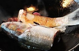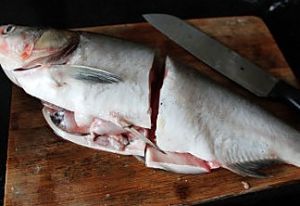 把鱼去鳞和内脏,清洗干净.鱼大锅小,斩成两截.