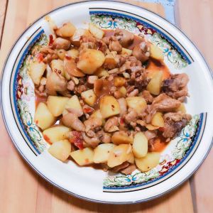 加入水,翻炒,加入切好的土豆块,锅开后换小火,慢炖,直至土豆熟了