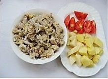 把筋头巴脑切成三厘米左右的小块,锅里烧开水,把肉放进去焯几分钟,捞出来沥水,土豆和西红柿切块
