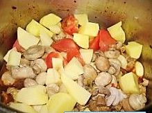 待高压锅能打开盖后,加入口蘑土豆西红柿和少许盐,继续压十五分钟就可以盛盘上桌了。