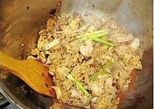 锅内放底油烧开,放姜片、蒜瓣、葱段、豆瓣酱爆锅煸炒,然后把筋头巴脑倒进去翻炒一会儿。添半锅水,花椒大料香叶桂皮放进去,高压锅大火压四十分钟