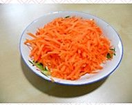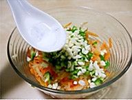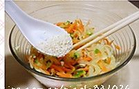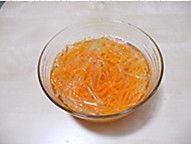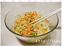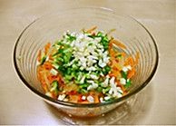 待降温后,将瓜皮丝和胡萝卜丝捞出,沥干水分,放入碗中,加入尖椒碎和蒜末;