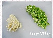 尖椒、蒜瓣切碎,小红辣椒切碎;
