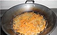 锅中烧水,水热后放入瓜皮丝和胡萝卜丝焯烫;