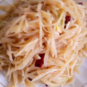 换大火倒入土豆丝爆炒,最后出锅前一勺盐翻匀