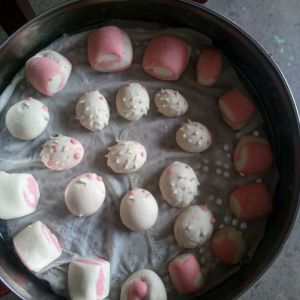 然后捏一小团红色的和白色的擀面杖分别擀薄两张放一起卷起来用刀切割好适量的大小