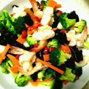 热锅凉油,下姜、蒜爆香,放入虾仁翻炒变色,直接下西蓝花、胡萝卜、黑木耳翻炒,加入少许盐,少许鸡汁、小葱段、红椒翻炒均匀即可