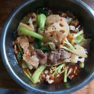 把油烧热,放入葱姜蒜炒香,放入香料炒香,改小火,放入火锅底料炒溶化。加入开水2碗烧开,放入盐,糖,鸡精,放入焯熟的菜和肉片煮开。