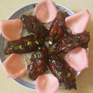 腌制完后,热锅下油放鸡中翅炸一下,炸至皮有些金黄色,放姜再炒一下,把可乐倒进去放老抽,大火收汁
