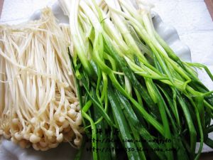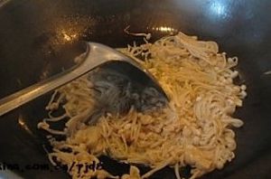 点火,锅里加少许油,下姜末爆香,下金针菇翻炒两下,紧接着把香葱也扔进去快速翻炒,加一勺盐,几滴酱油调味,清淡美味的一道菜就出锅了。