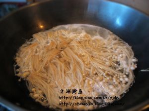锅里烧开水,把金针菇扔进去烫软,然后捞出来沥水,这个过程很短,一分钟就行。