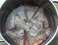 将脊骨洗净,放入锅里加入清水,浸泡1小时。这时可以看到脊骨里的血水泡出来,捞出脊骨冲洗干净。
