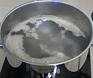 锅下水烧开后,将脊骨放入焯水,再冲洗净脊骨表面的浮沫。