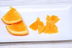 橙子一半切开取果肉切成小块,另一半挤出鲜橙汁待用。