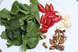 嫩菠菜,用开水烫一下去掉草酸,切小段,圣女果切开,鲜奶酪掰成小块,熟核桃仁掰开小块。