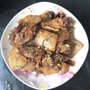 把烘干的鸡翅放无油的锅中炸熟,放碗里,再把土豆锅里炒熟。