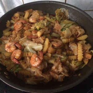 把红薯,土豆,虾,银耳放锅里翻炒,都上色后加热水(少量即可,因为生菜里也会出点水),煮沸后放生菜,将生菜翻炒到其他菜下,生菜变软后大火收汁,美味的香锅就OK了
