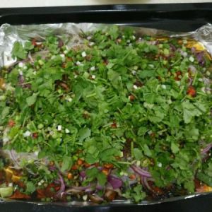 放上茄子,然后在茄子上刷上之前调好的酱料,再分别放上蘑菇、粉丝、洋葱、辣椒面、花椒面、辣椒圈,再放入烤箱,温度200,上下火,烤二十五分钟